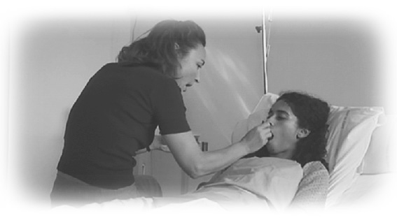 ベッドでリハビリの介添をエレーヌがする。